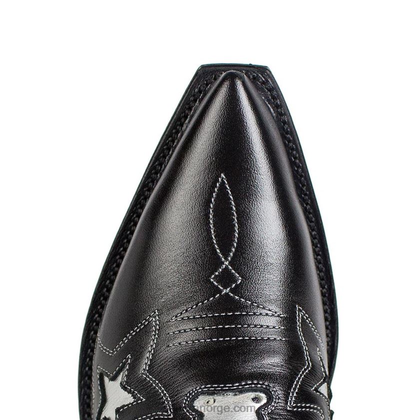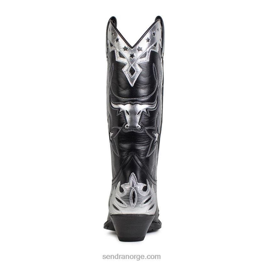 sendra-støvler med spiss lest og cubansk hæl. kombinasjon av svart og sølv skinn med dekorative stjerner på skaftet og på vampen. en klassiker gjenvunnet for ikke å gå ubemerket hen. nyt en ny modell for samlingen din som selvfølgelig er produsert med Goodyear-systemet som garanterer kvaliteten til merket Sendra.