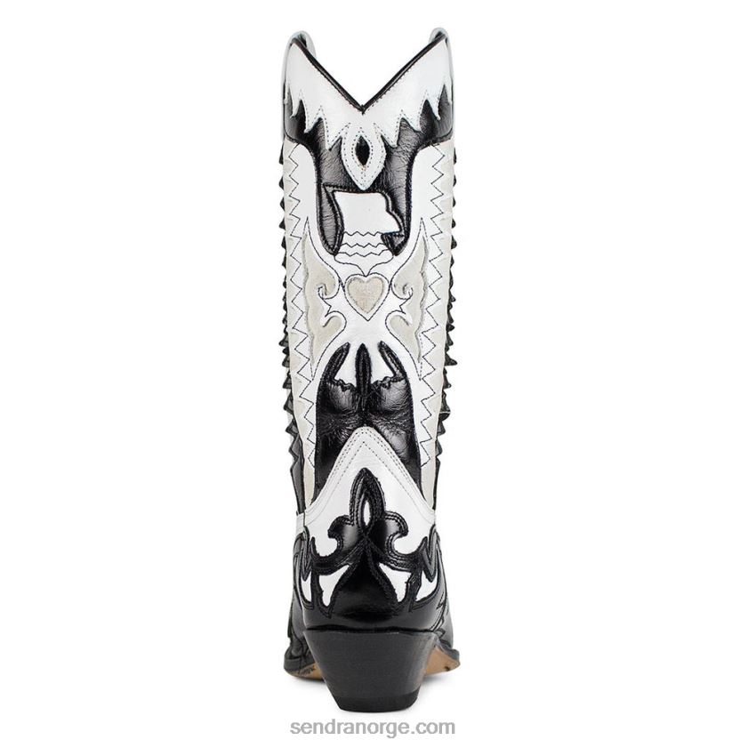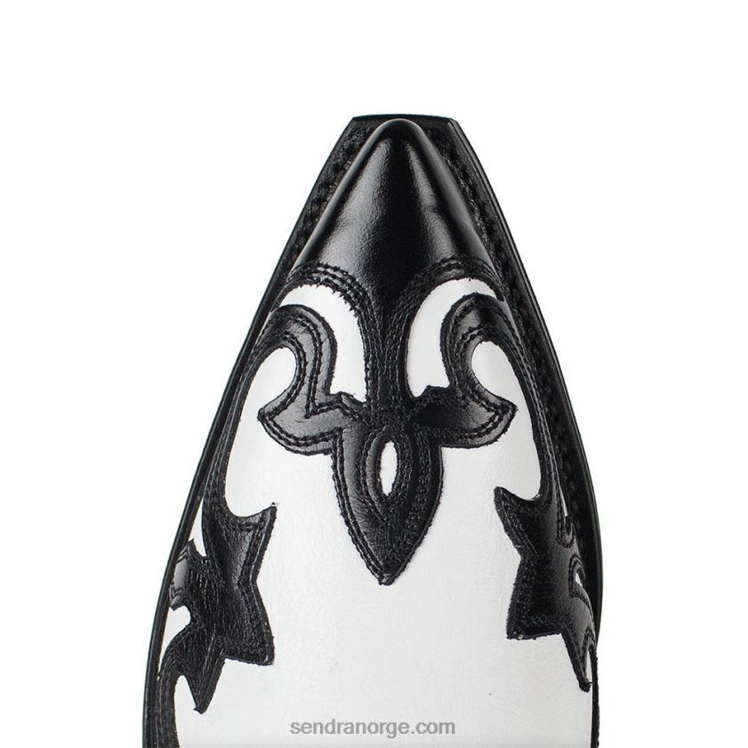 fantastisk skinnstøvel med en blanding av svarte og hvite farger, broderi og gjennombruddsdesign på skaftet og overdelen. den har en cubansk hæl og den klassiske cuervo-lasten for å gi deg en unik stil som bare sendra vet hvordan.