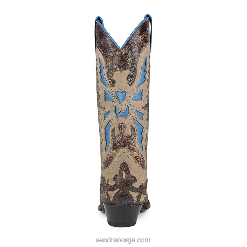 brun støvel med mørkebrunt broderi gjennom hele produktet og litt blått broderi på skaftet. semi-kubansk 4,5 cm hæl for større komfort når du går uten å miste eleganse.