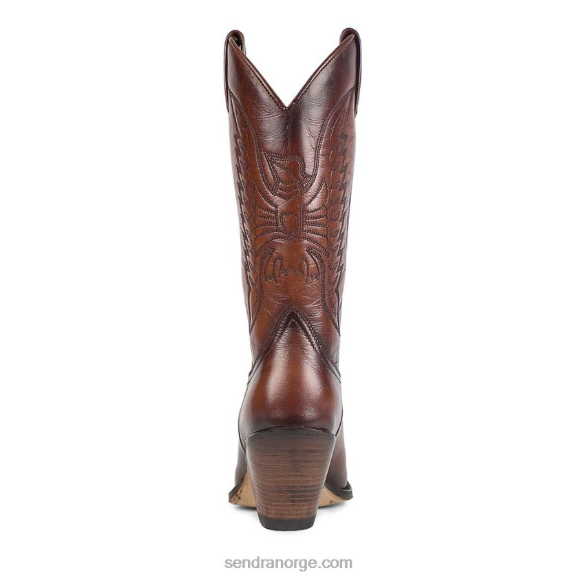 sendra damestøvel, i brunt skinn med spiss lest og 7,5 cm hæl, med omsydd design på tå og hæl, skinnsåle, en klassisk modell med tillegg av flere hæler for å gjøre den mer feminin.