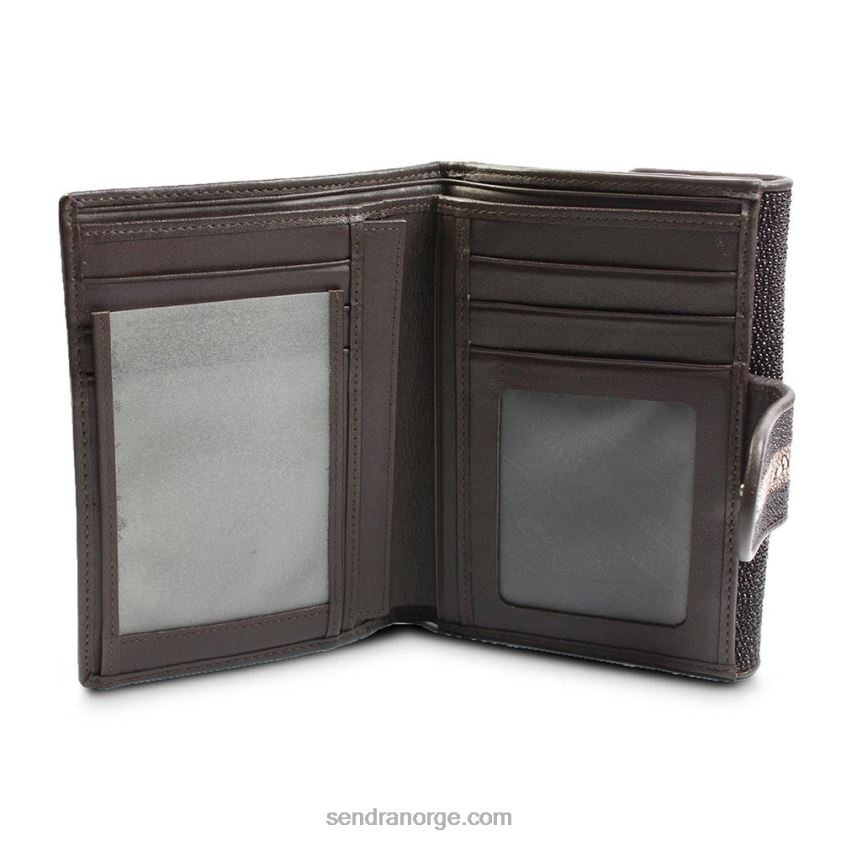 sendra damelommebok i brunt rokkeskinn med skorpionmønster. interiør med ulike spor for kort og sedler, og utvendig veskelomme med kile med sendra-garanti.