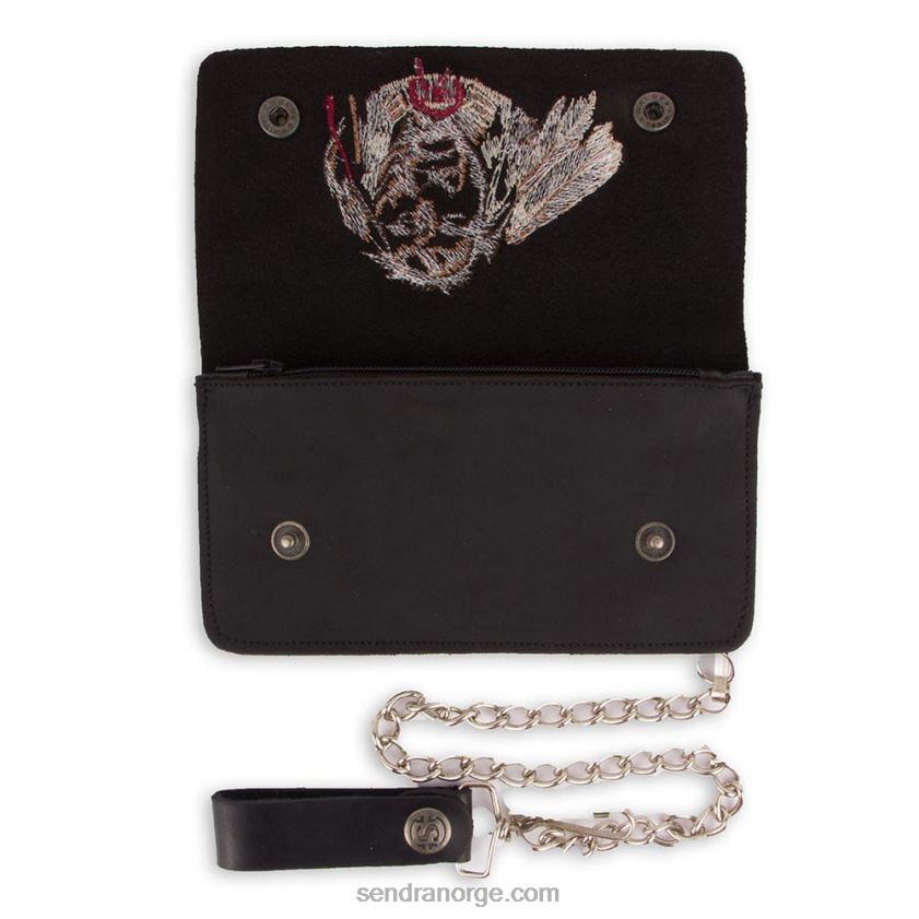 sendra-skinnlommebok, med broderi av en indisk biker-stil med kjede og karabinlås for større sikkerhet, 2 rom for sedler og dokumenter og 1 lomme med glidelås for mynter med vår sendra-garanti.