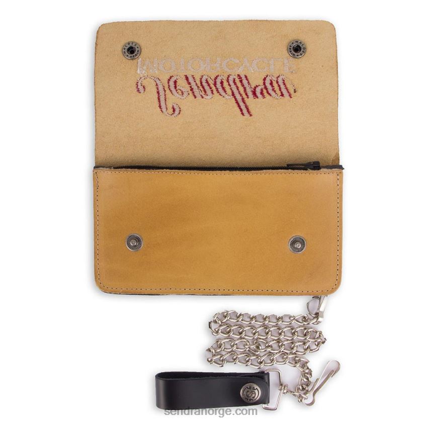 sendra-skinnlommebok, med broderi, biker-stil med kjede og karabinlås for større sikkerhet, 2 rom for sedler og dokumenter og 1 lomme med glidelås for mynter med vår sendra-garanti.