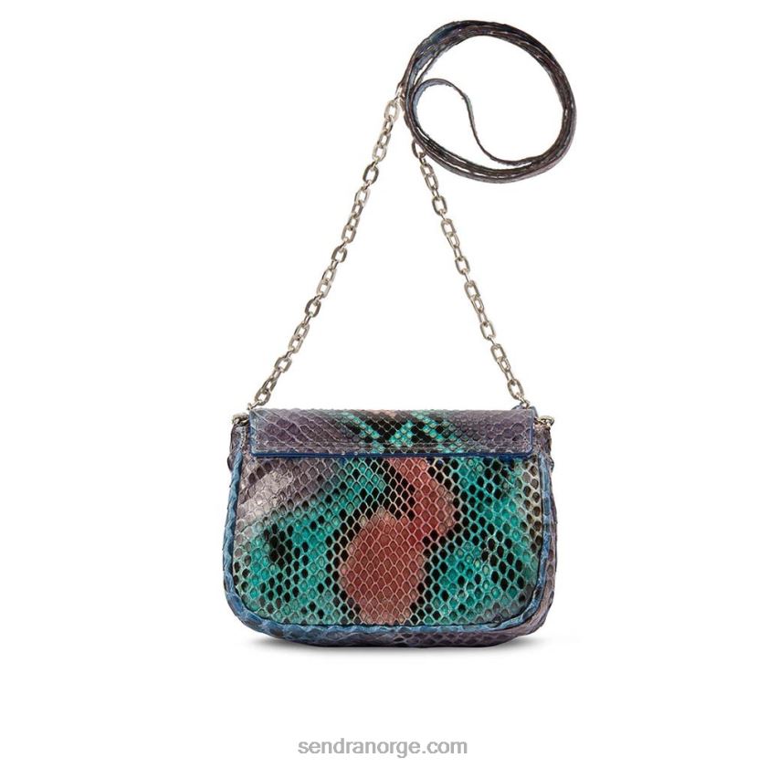 skalert skinnveske med en oransje, brun, grønn og blå fargekombinasjon. håndtak forbundet med en kjede.
