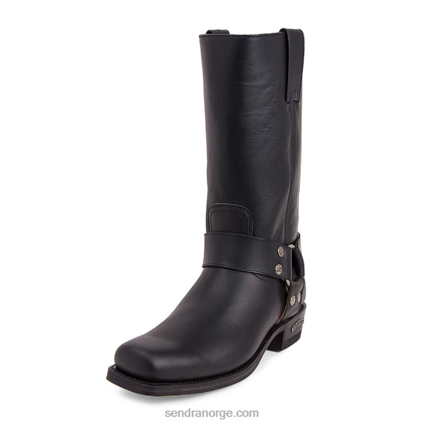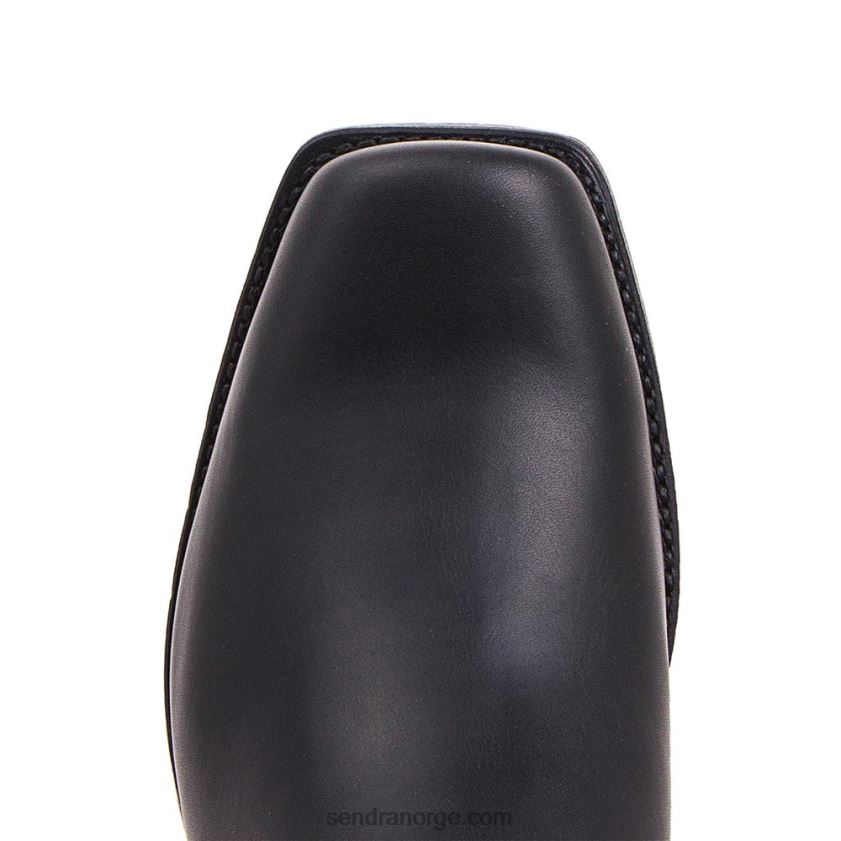 sendra-støvel i svart skinn, biker-stil, unisex, med firkantet tå og en nesten rett semi-kubansk hæl, med en designersele på vristen og en gummisåle for større komfort og god produksjon.