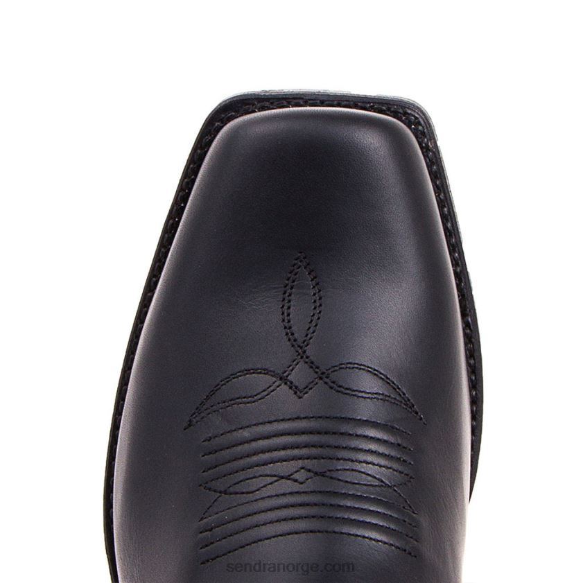 sendra unisex-støvel i svart skinn, doble sømmer på skaft og vrist, en biker-modell med et snev av cowboy; ankelsele, halv cubansk hæl, Goodyear welt-konstruksjon.