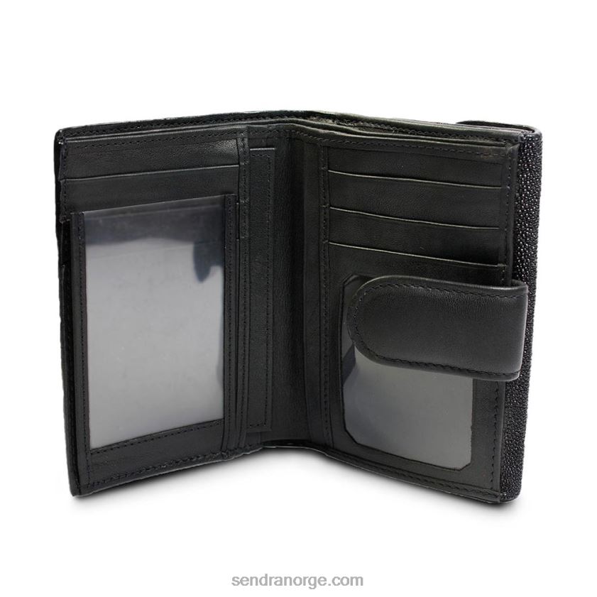 sendra damelommebok i svart manta ray-skinn. interiør med ulike spor for kort og sedler, og utvendig veskelomme med kile med sendra-garanti.