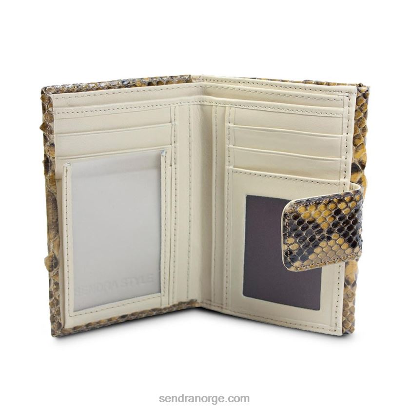 sendra lommebok i pythonskinn for kvinner. innvendig med ulike spor for kort og sedler, og utvendig veskelomme med kile med sendra-garanti